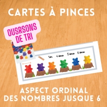 Découvrez une activité conçue pour l'apprentissage de l'aspect ordinal du nombre jusqu'à 6. Avec nos cartes à pinces et vos oursons de tri, l'enfant apprend à identifier la position d'un objet dans une série.