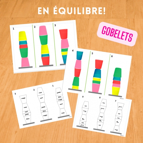 L’enfant va devoir constituer une tour de 5 gobelets, soit en utilisant les modèles - couleurs, soit en utilisant les modèles-mots.
