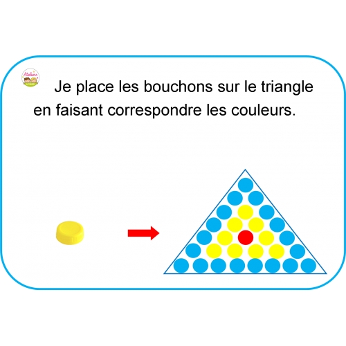 - Une fiche support pour mettre les bouchons représentant un triangle vierge avec ou sans repères (rond pour placer les bouchons, avec deux autres carrés à l'intérieur pour définir les "colonnes", vide.)