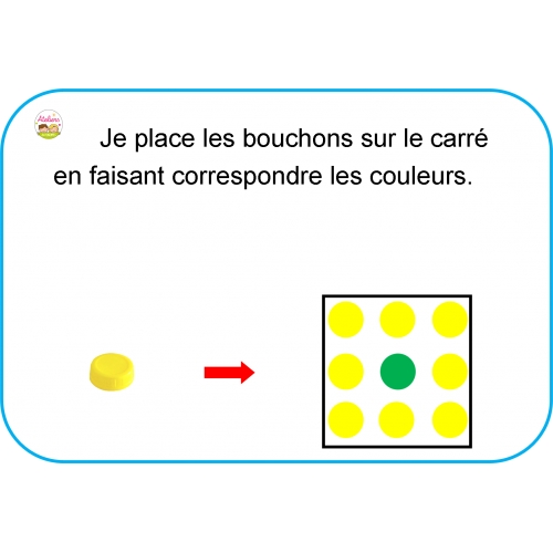 - Une fiche support pour mettre les bouchons représentant un carré vierge avec ou sans repères (rond pour placer les bouchons, avec un autre carré à l'intérieur pour définir les "colonnes", vide.)