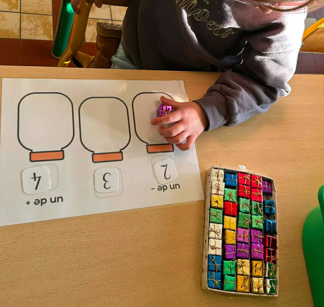 Jeu 1 - Reproduction de modèle : L'enfant doit placer ses cubes ou petits cadeaux sur la fiche support en reproduisant exactement le modèle visuel proposé.